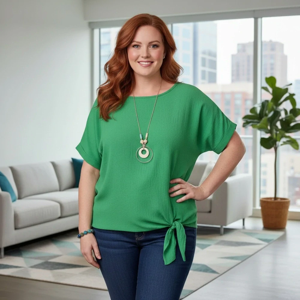 Díky univerzální velikosti sedí postavám od L po XXL, což ocení zejména ženy s plnějšími tvary. Modelky na obrázku ukazují, jak dobře se tričko přizpůsobí různým postavám – zachovává ženskou siluetu a zároveň šikovně zakrývá bříško i další drobné nedokonalosti. Výrazným prvkem je uzel v pase, který dodává šmrnc a opticky zeštíhluje.