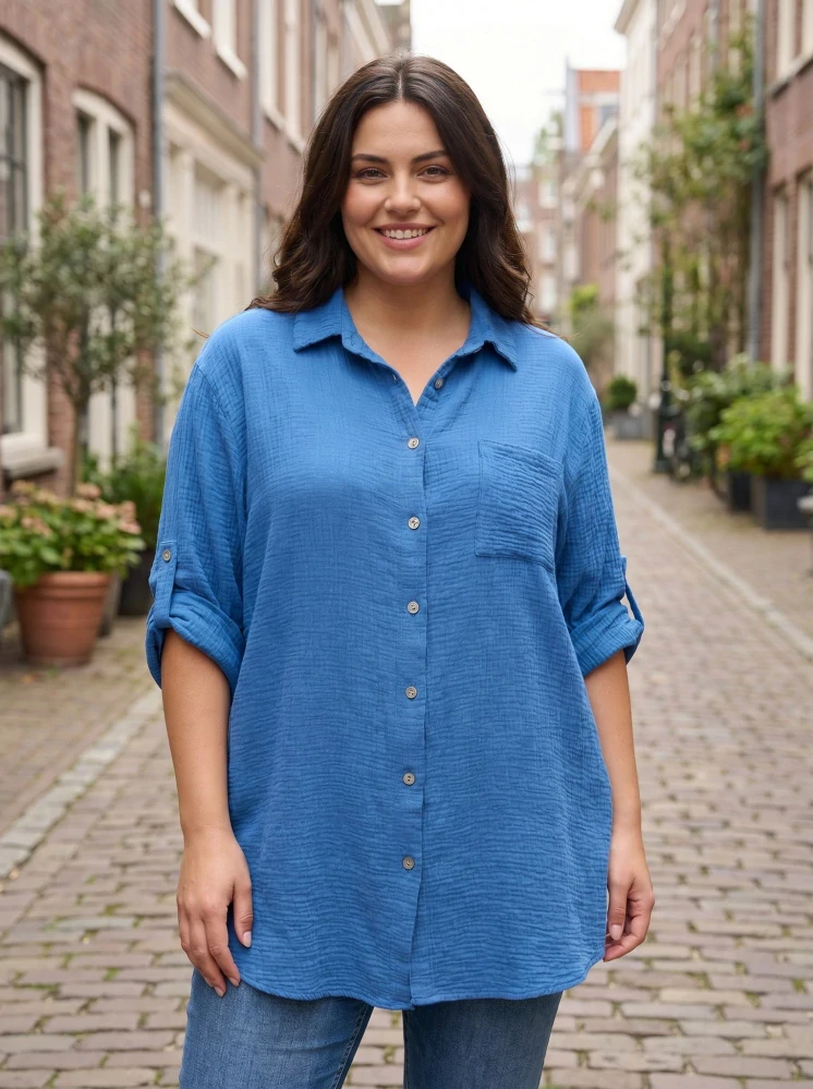 Mušelínová košile Gil je vyrobena ze 100% bavlny, která je příjemná a prodyšná. Díky střihu s obvodem 132 cm přes prsa a 141 cm přes boky nabízí maximální komfort bez omezování. Střih lichotí postavě a skvěle vypadá k úzkým kalhotám i legínám. Rukávy jsou 3/4 a po ohrnutí se dají zajistit knoflíkem