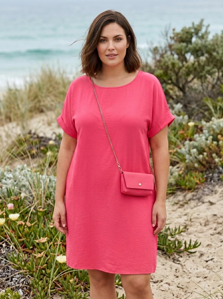 Komfortní střih L–XXL. Šaty jsou navrženy v univerzální velikosti s důrazem na potřeby plnoštíhlých dam. S obvodem 126 cm přes prsa a 132 cm přes boky poskytují dostatek prostoru, aniž by působily příliš robustně. Výrazným prvkem je odnímatelná minikabelka na zlatém řetízku, do které pohodlně schováte drobnosti.