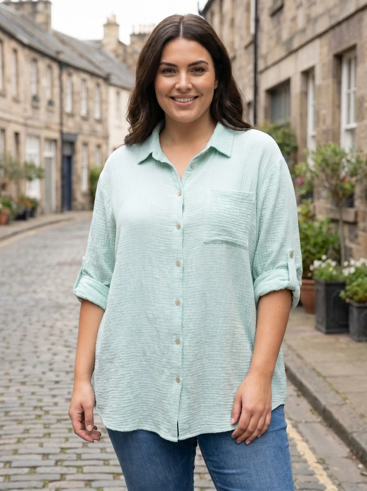 Mušelínová košile Gil je vyrobena ze 100% bavlny, která je příjemná a prodyšná. Díky střihu s obvodem 132 cm přes prsa a 141 cm přes boky nabízí maximální komfort bez omezování. Střih lichotí postavě a skvěle vypadá k úzkým kalhotám i legínám. Rukávy jsou 3/4 a po ohrnutí se dají zajistit knoflíkem